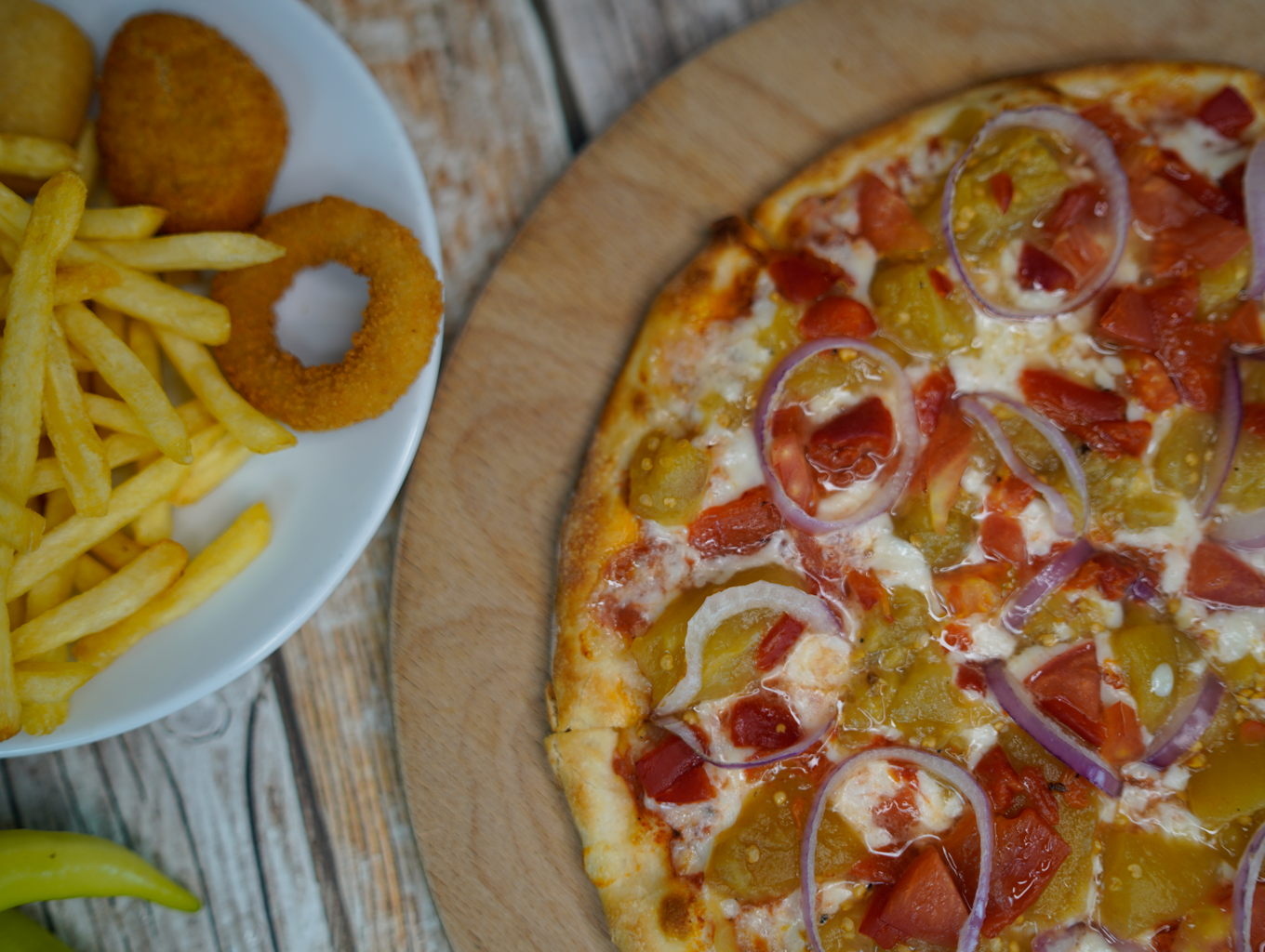 Domates Sosu, Mozarella Peyniri, Közlenmiş Patlıcan, Közlenmiş Kırmızı Biber, Dometes, Soğan